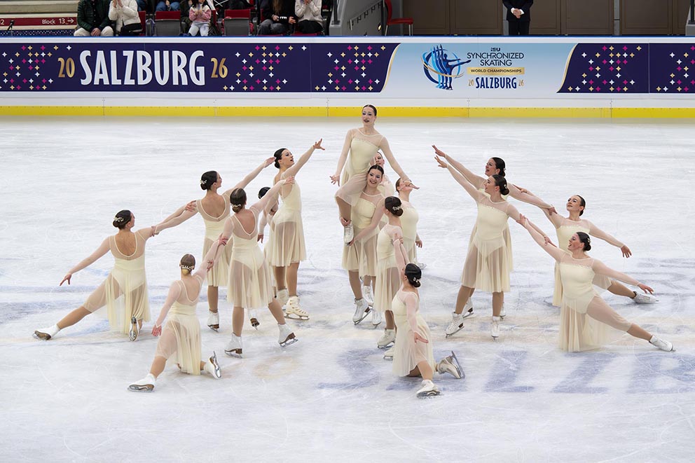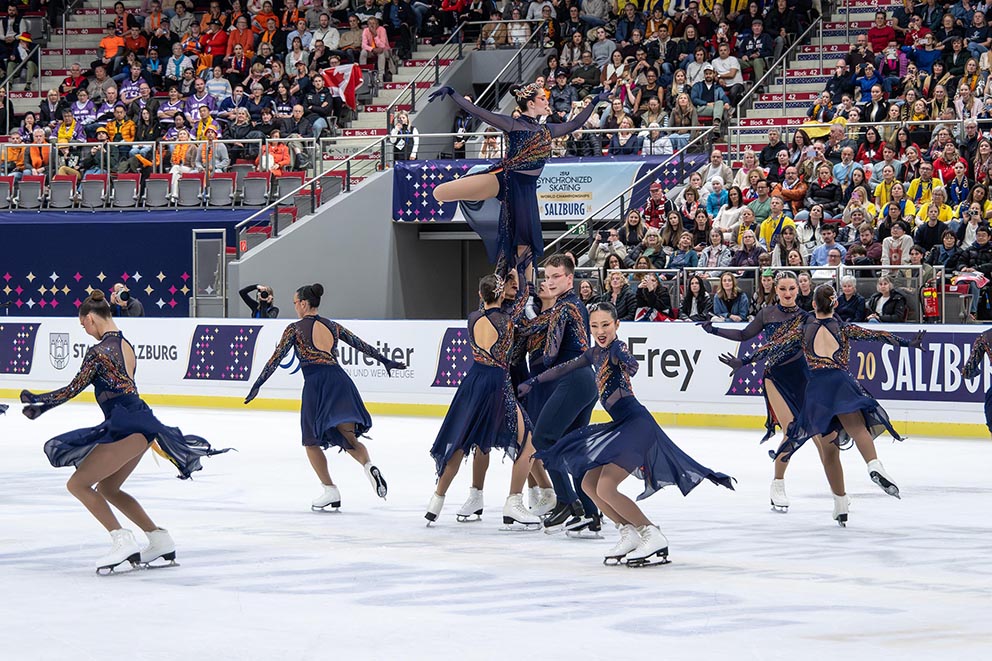 Die viertbeste Kürleistung im Feld reichte Les Supremes, um mit 233,00 Punkten WM-Gold zu sichern. „Wir waren super glücklich, als wir den Score gesehen haben“, gab Team-Captain Olivia Di Giandomenico nach einer kurzen Nervenprobe in der Kiss & Cry Zone zu. „Wir sind sehr glücklich, dass wir diesem fabelhaften Publikum hier in der Salzburgarena zwei tolle Auftritte zeigen konnten“, so die 25-Jährige. Co-Captain Julia Bennett ergänzte: „Wir hatten über die gesamte Saison eine fantastische Chemie im Team, wir haben optimal zusammengearbeitet. Es ist eine fantastische Krönung eines unvergesslichen Jahres!“